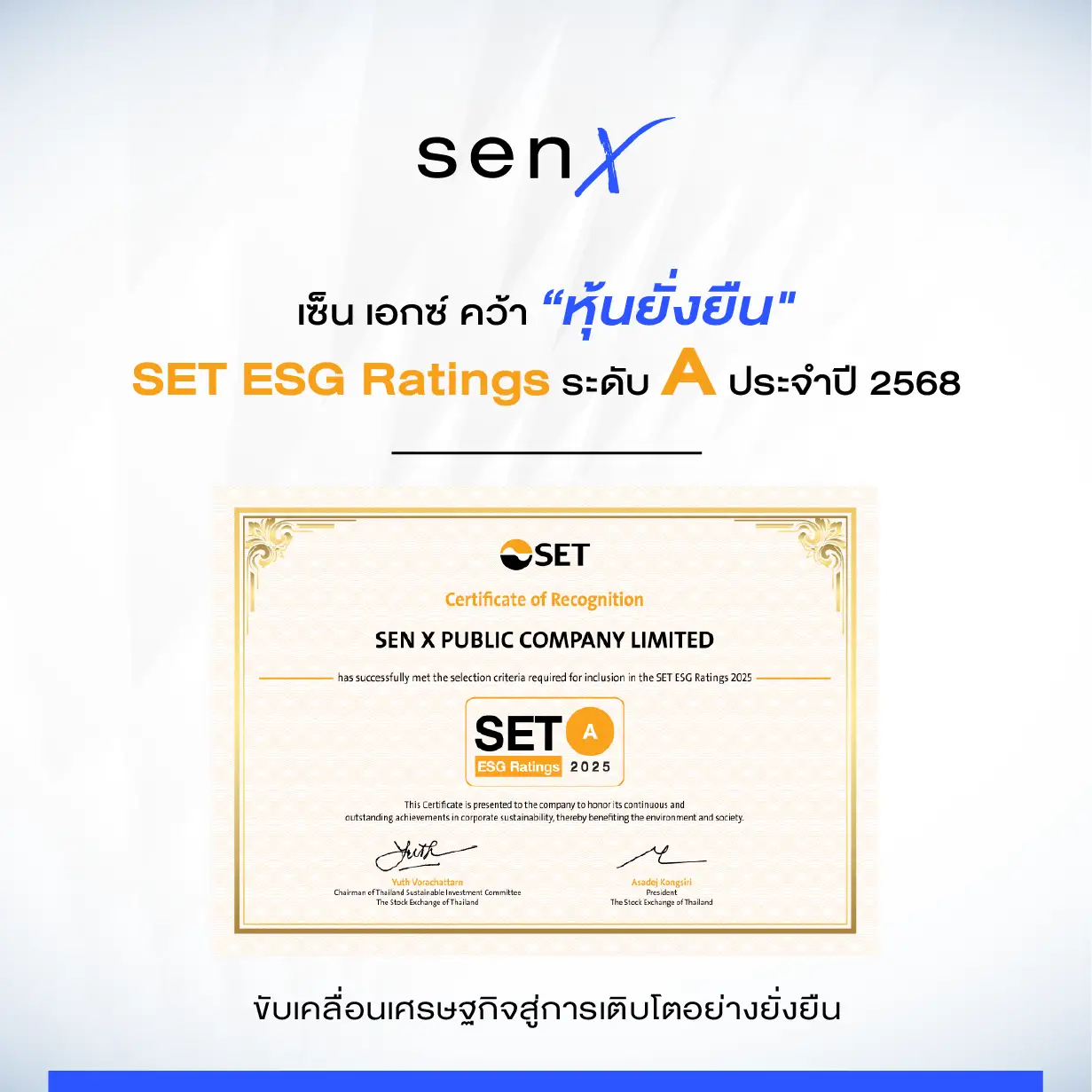 เซ็น เอกซ์ คว้าการประเมิน หุ้นยั่งยืน “SET ESG Ratings ระดับ A” สะท้อนการขับเคลื่อนธุรกิจสู่การเติบโตยั่งยืนอย่างเป็นรูปธรรม
