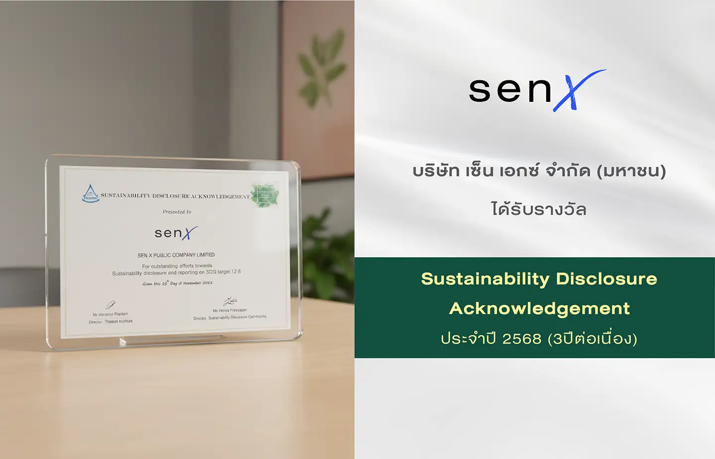 บริษัท เซ็น เอ็กซ์ จำกัด (มหาชน) หรือ Sen X ผู้ให้บริการด้านบริหารจัดการโครงการที่พักอาศัยครบวงจร ในเครือเสนาดีเวลลอปเม้นท์ โดย นางวรรณิภา วุฒิวัฒน์ กรรมการบริหาร เข้ารับรางวัลด้านการเปิดเผยข้อมูลความยั่งยืน Sustainability Disclosure Acknowledgement ประจำปี 2568 ต่อเนื่องเป็นปีที่ 3 ในงาน “The State of Corporate Sustainability in 2025” จาก นายวรณัฐ เพียรธรรม ผู้อำนวยการสถาบันไทยพัฒน์ ในฐานะองค์กรที่แสดงถึงความตั้งใจและความพยายามเชิงบวกในการเปิดเผยข้อมูลด้านความยั่งยืนตาม SDG 12.6 แม้จะเป็นระดับเริ่มต้น แต่ถือเป็นก้าวสำคัญสู่การพัฒนาระบบการรายงานความยั่งยืนที่ครอบคลุม โปร่งใส และตอบสนองมาตรฐาน ESG มากยิ่งขึ้นณ ห้องออดิทอเรียม ชั้น 5 หอศิลปวัฒนธรรมแห่งกรุงเทพมหานคร